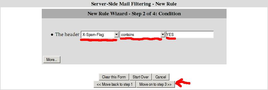 - Select "X-Spam-Flag:" from the first drop down menu